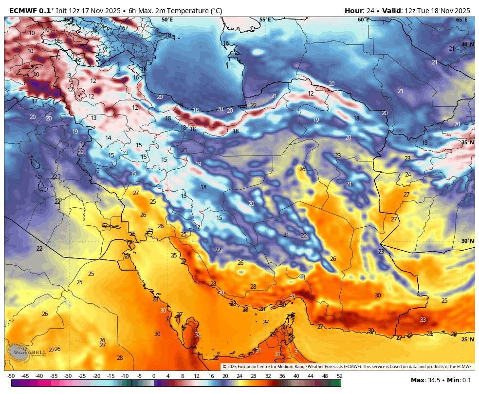 ضیائیان بیان کرد: آسمان تهران امروز (۲۷ آبان) صاف، گاهی همراه با وزش باد ملایم و بهتدریج با غبار رقیق پیشبینی میشود. دمای کمینه تهران ۹ درجه و بیشینه آن ۱۸ درجه سانتیگراد خواهد بود.